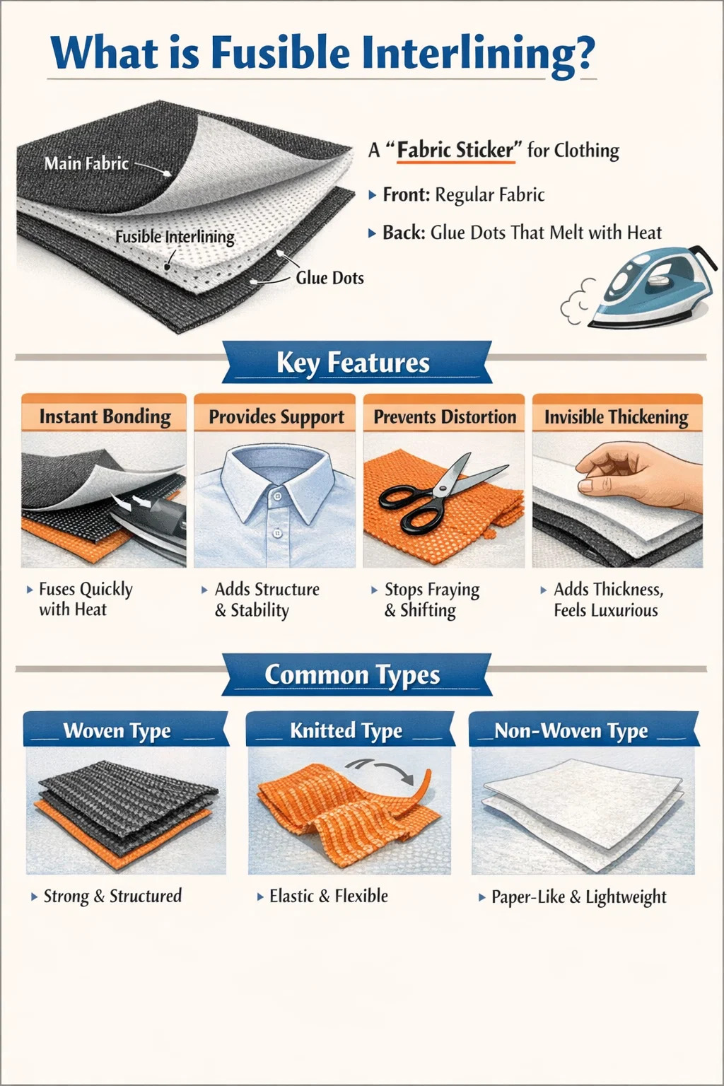L'interfodera fusibile è un tipo speciale di tessuto ausiliario con "colla" sul retro. È un materiale molto comune nella produzione di abbigliamento moderno, rendendo la produzione di abbigliamento più semplice ed efficiente.