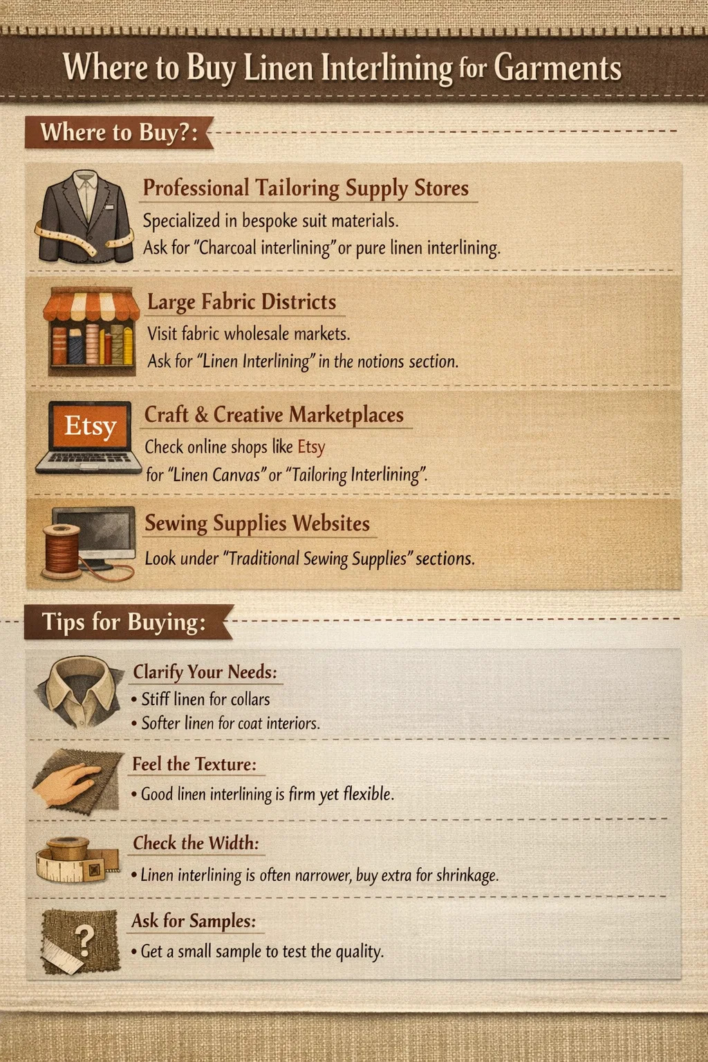 Se stai cercando di acquistare biancheria interfodera o l'interfaccia per la realizzazione di indumenti, ci sono diverse fonti affidabili che puoi esplorare. Dato che il lino è un materiale relativamente di fascia alta utilizzato negli abiti su misura e nell'abbigliamento prêt-à-porter di alta qualità, dovrai cercare nei negozi di tessuti specializzati.